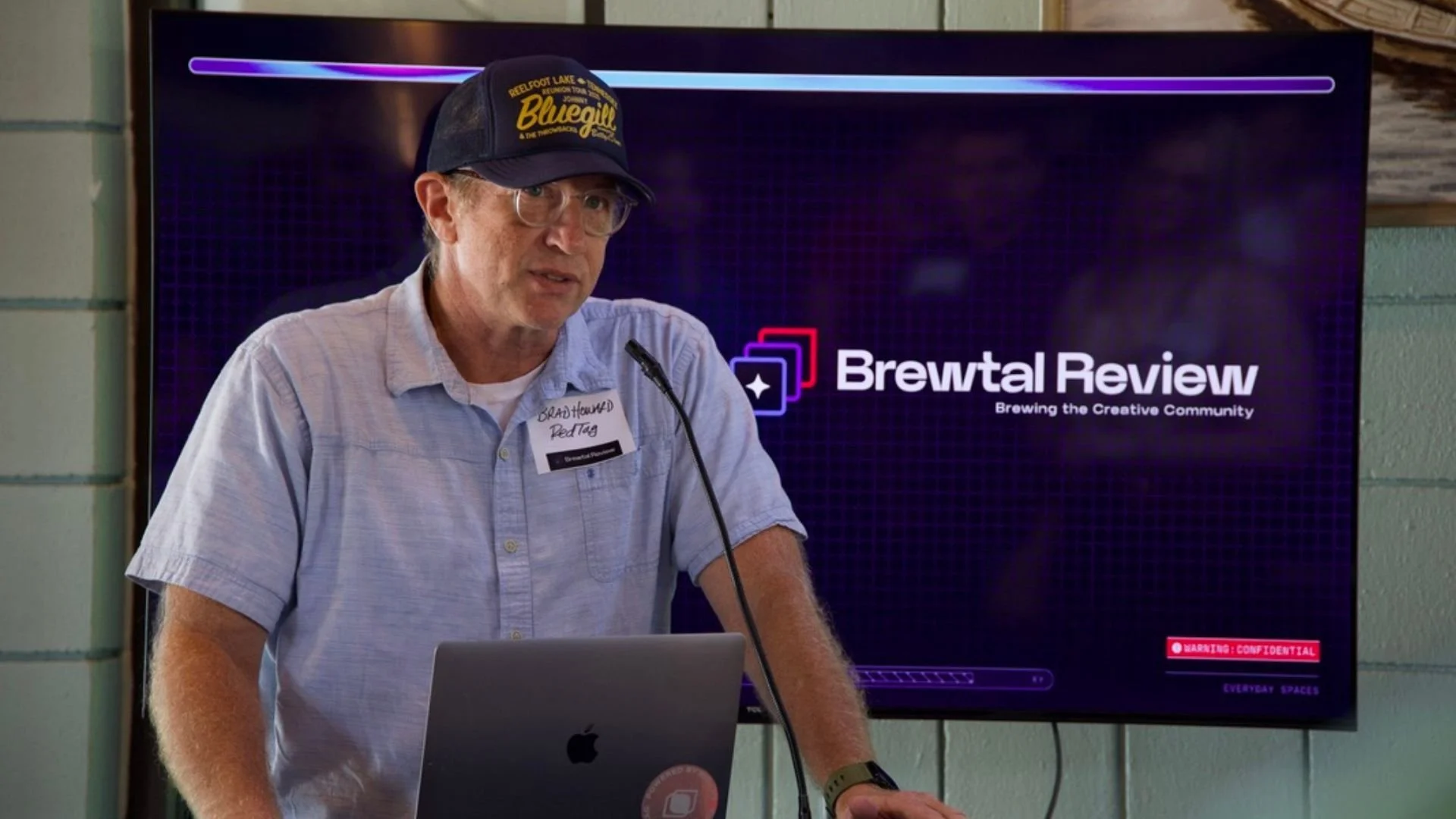 RedTag Creative Director, Brad Howard, speaking at the launch party with the Brewtal Review wordmark.