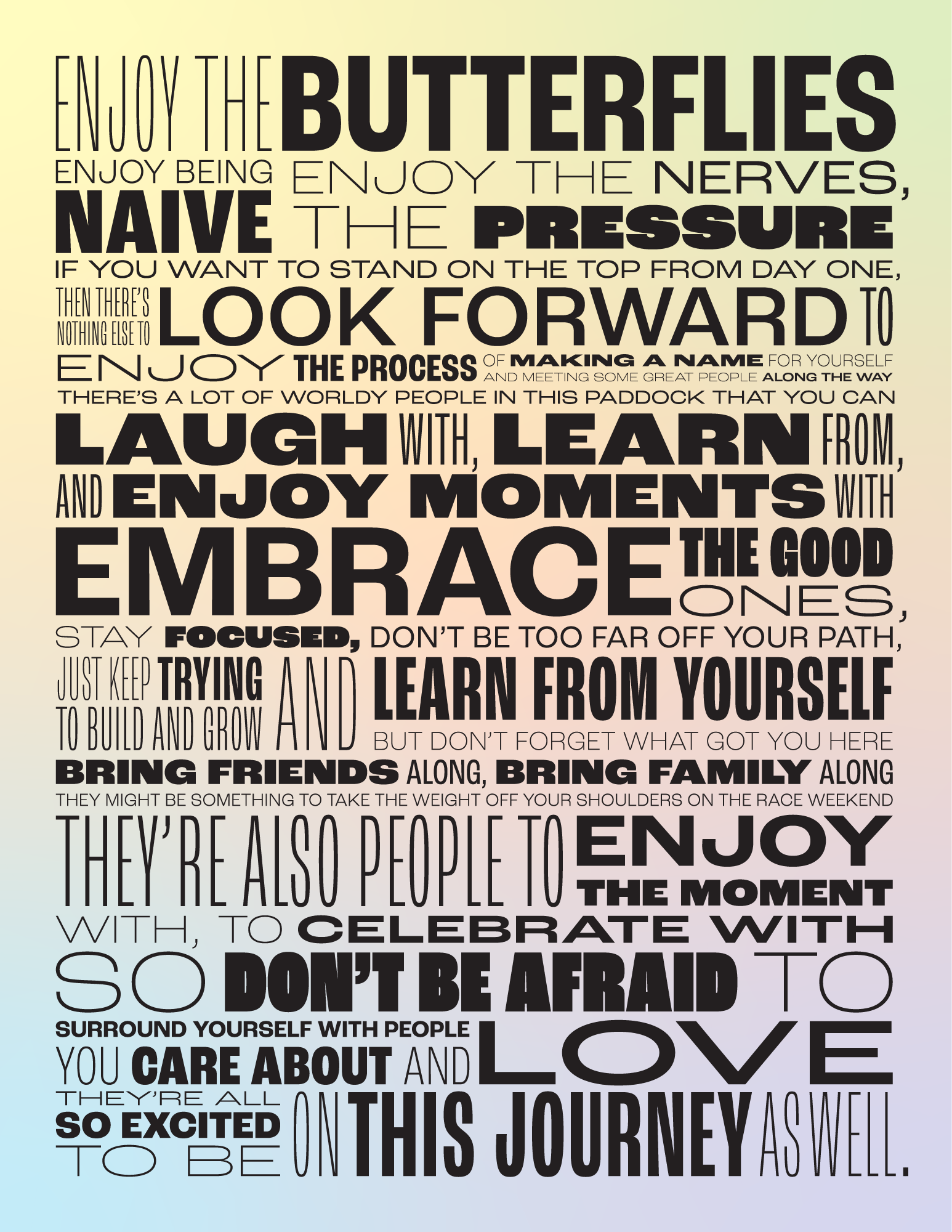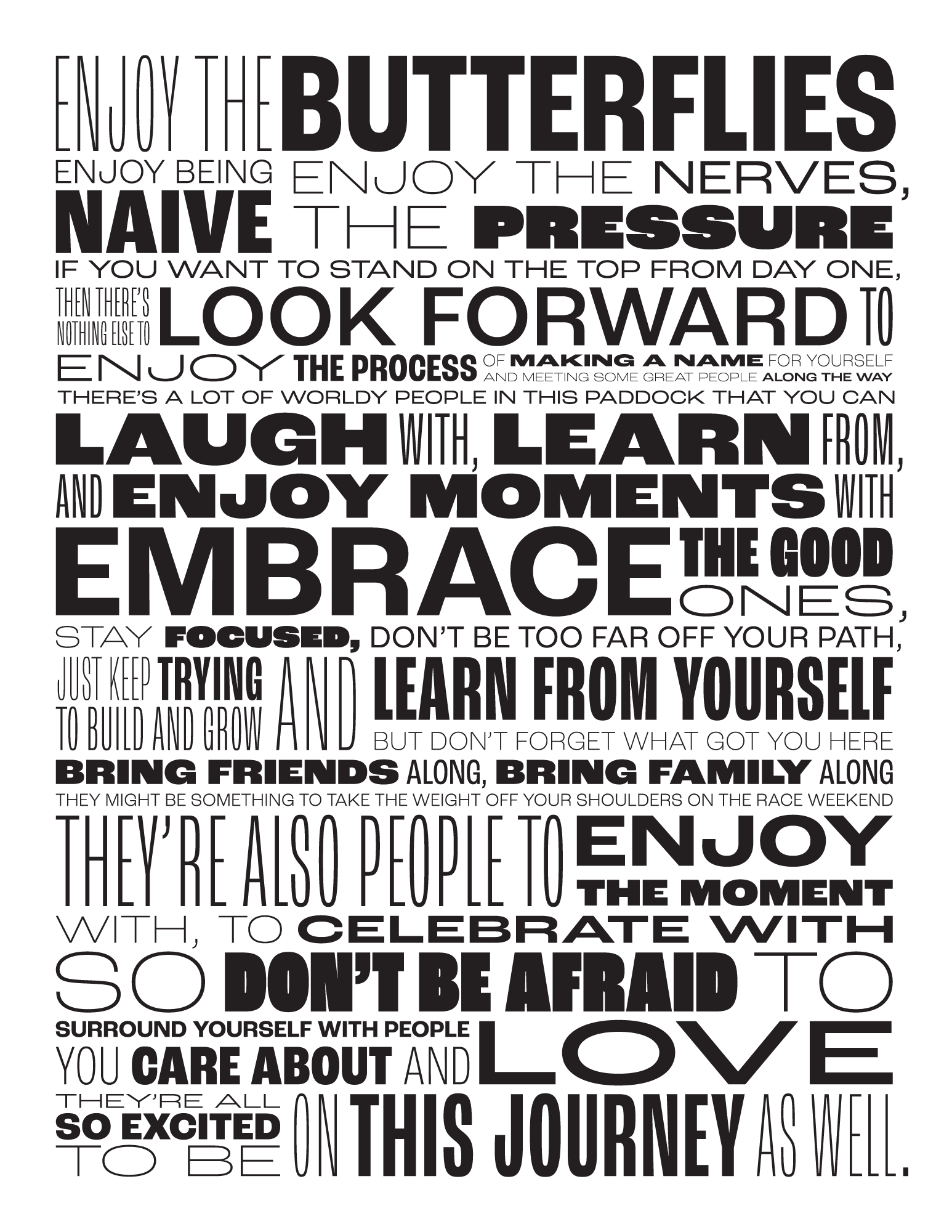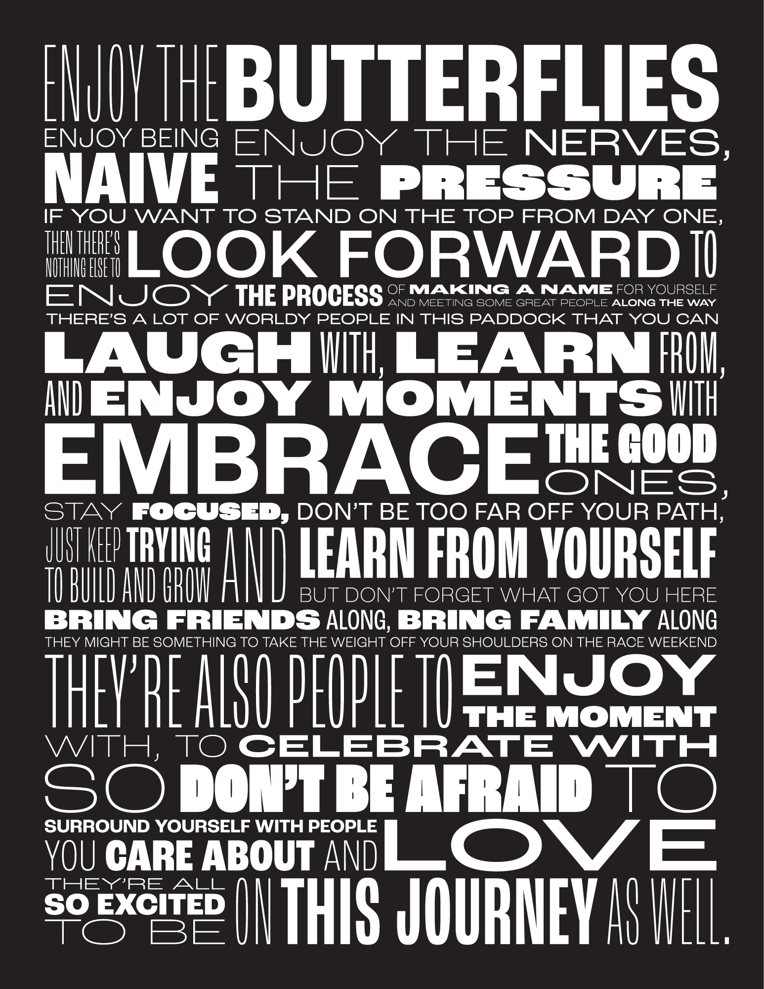ENJOY THE BUTTERFLIESDANIEL RICCIARDO QUOTE POSTER View fullsize Versions: View fullsize View fullsize View fullsize Font used:Roc Grotesk from Adobe Fonts